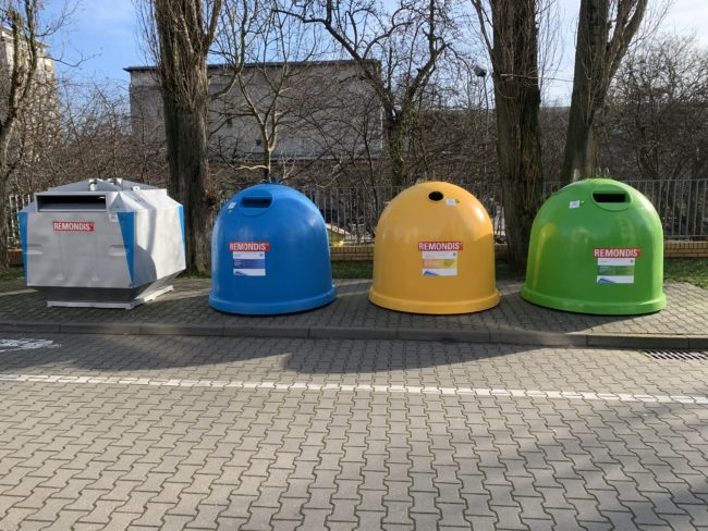 Pozostałe pojemniki do segregacji odpadów komunalnych pod chmurką.