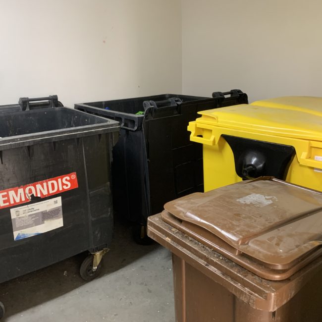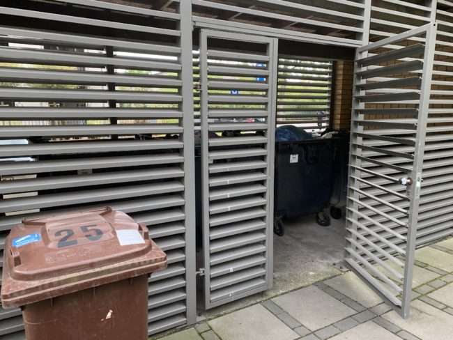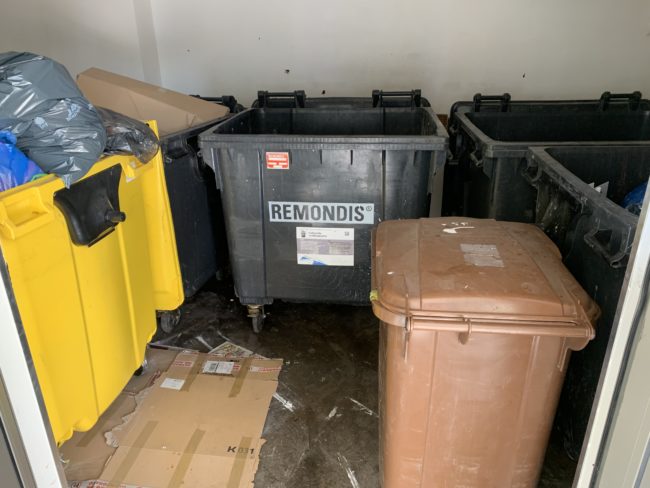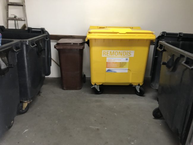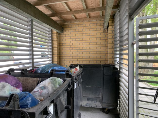 Generalnie na osiedlu zasada jest taka, iż ze względu na zbyt małą kubaturę pomieszczeń żółte, zielone i niebieskie pojemniki do segregacji są w jednym miejscu na zewnątrz. Natomiast szare i brązowe są w pomieszczeniach zadaszonych. Dodatkowo dla komfortu w pomieszczeniach zadaszonych przyległych do bloków: drugiego, trzeciego i czwartego udało się zmieścić żółte pojemniki na plastik i metal, które po szarych pojemnikach na odpady zmieszane zapełniają się najszybciej.