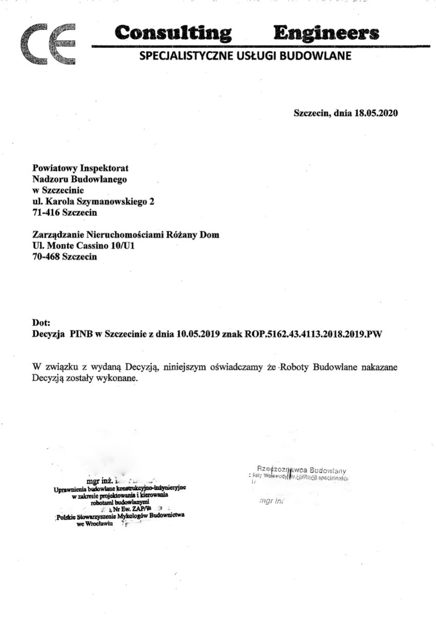 5. Odbiór prac bez uwag (przez między innymi autora ekspertyzy oraz inżyniera z ramienia naszego zarządcy). Okres gwarancji na wykonane prace do dnia 8.05.2022 r.